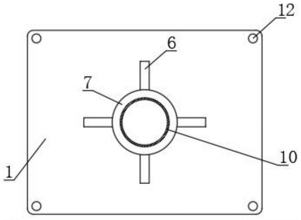 本实施例中,优选的,柱形块7的外壁设置有多个加强筋6,进一步增加柱形块7的刚性,下底座1的表面贯穿开设有多个固定孔12,便于通过螺钉穿过固定孔12,将下底座1紧固。