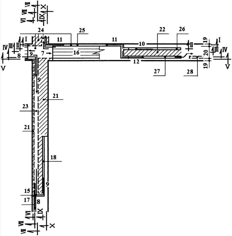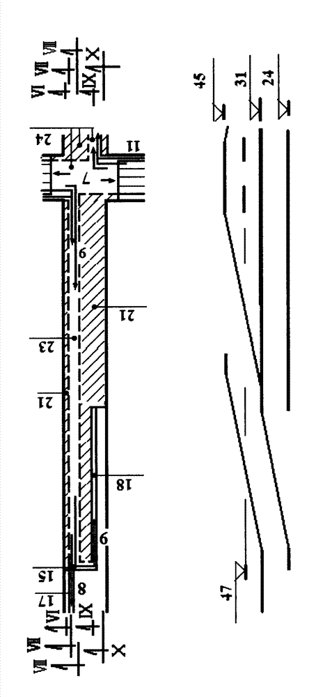 一石三鸟之一,增加一车道:仿楼房单跑直行楼梯一层摞一层。天桥道路,在附图的(18)“涵道左 拐车上坡回归地面”的上方,为欲拐弯的车流加一层与之平行的上坡道,提前上坡,新加上坡道到达桥 顶标高之后,向右错一错,借用、改走自行车范围的上方,直走到路口拐弯,将正常上桥宝贵的主坡道留 给直行车和附图的(18)“涵道左拐车上坡回归地面”的车流,形成多一车道进路口,见图6;同理,涵 道道路,多一车道进路口,见图3。