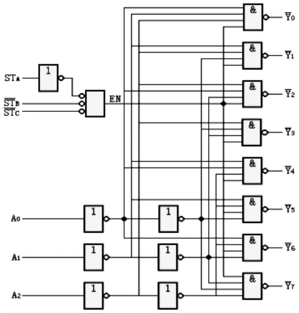 处理器在对内存进行读写操作时,需要将地址总线的二进制代码译成相应的输出信号,并以此信号选中存储单元的电路。如图1所示的一种现有的地址译码电路,它有3个输入端8个输出端,输入端A0-A2为二进制代码;输出端Y0-Y7低电平0有效,使能端为0时译码器禁止译码,使能端为1时译码器工作,这时,译码器输出Y0-Y7由输入的二进制代码决定。其缺点是该方案输出端与非门的输入端位数与地址位数相关,增加地址位等于增加输出端与非门的输入端数量,使得输出端与非门所需的元器件增加。