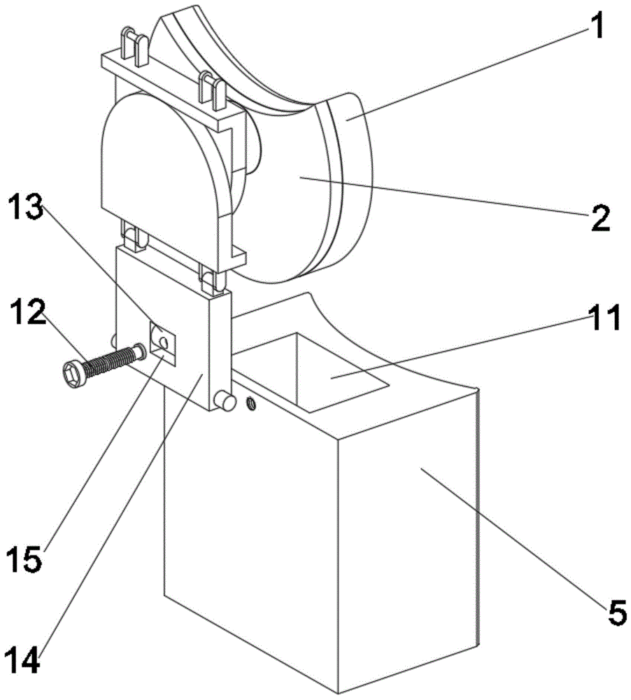 图中标号说明:1、海绵垫;2、固定板;3、转块;4、插框;5、固定块;6、插槽;7、调节槽;8、安装槽;9、卡舌;10、弹簧;11、矩形槽;12、调节螺栓;13、转轴;14、调节板;15、转槽。