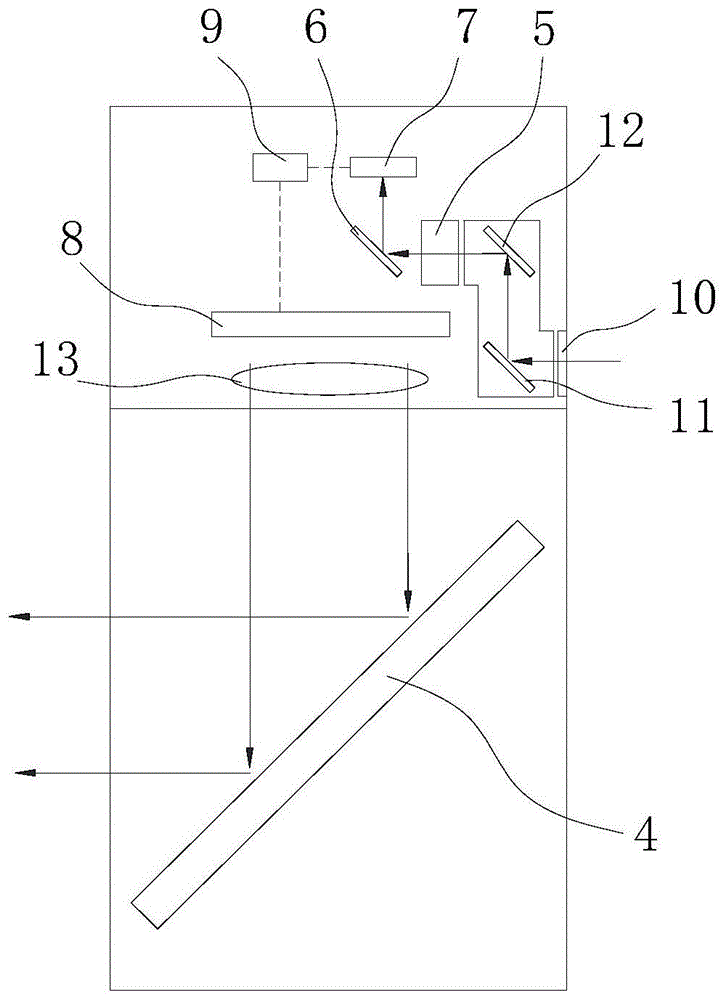 具体的,镜头5设置在壳体16内部,镜头5前方设有潜望镜,潜望镜前方设有偏振片10,潜望镜包括平行设置的第二反射镜11和第二玻璃12,光线从偏振片10进入后,依次经过第二反射镜11的反射和第二玻璃12的反射后进入镜头5。放大镜13设置在显示屏8和第一玻璃4之间。