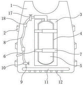 与现有技术相比,本实用新型的有益效果是:本实用新型的一种具有辅助游泳功能的救生衣,通过设置托板,可以将穿戴者头部略微托起一定高度,使头部漏出水面,避免呛水、溺水,不需要穿戴者用力昂起头,通过设置喷气夹角约为90°的第一喷气头和第二喷气头,无论穿戴者处于俯趴或者是接近直立的姿态,两组喷头都没入水中,通过喷气产生浮力和推力,可以满足穿戴者在不同姿态下的漂浮、游动的需要,有利于穿戴者节省体力,提高安全性,避免穿戴者在水中因体力消耗过大无力游动出现危险情况,实用性好。