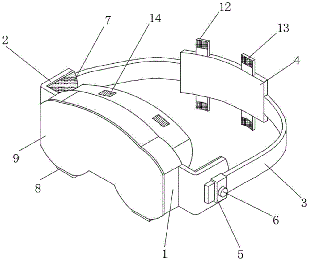 本实用新型的目的是为了解决现有技术中VR设备在收纳时通常缺乏对镜片的防护,容易使镜片沾染污物,影响使用的问题,而提出的一种用于运动康复的便于收纳的头戴式VR设备。