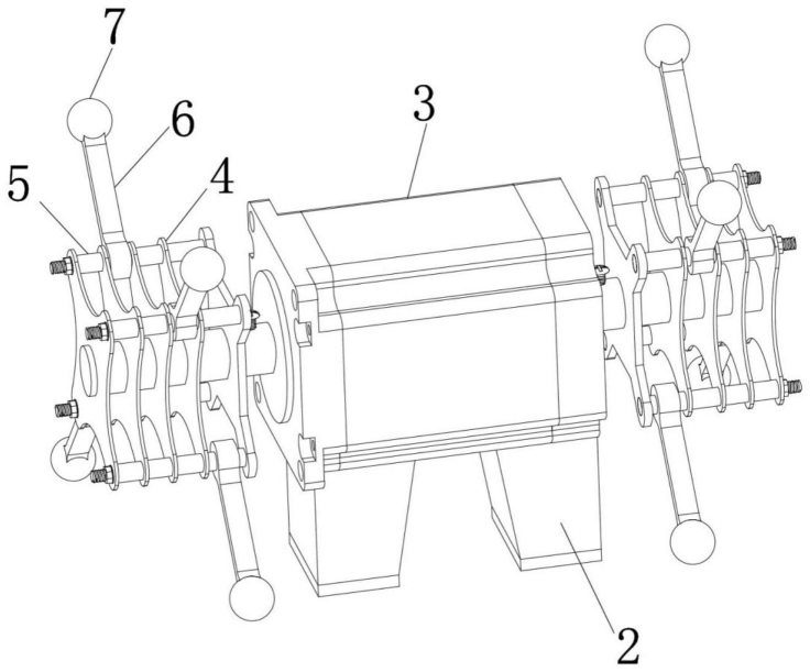 本实用新型方形旋转安装板为五个,相应的旋转柄和柔性捶打球均为四个;每个方形旋转安装板两个顶角之间的边下凹。