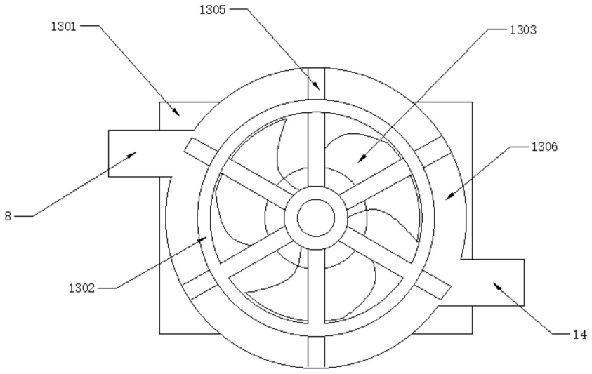 优选的,所述涡轮组件是由壳体、安装架、叶片、传动轴和传动叶片组合而成,所述壳体内设置有安装架,且安装架上设置有叶片,且叶片下方设置有传动轴,所述传动轴远离叶片的一侧设置有传动叶片,所述壳体内部开设有传动槽,且传动叶片位于传动槽上,且传动叶片与传动槽之间设置有垫片,所述传动槽一侧设置有送气管,另侧传动槽设置有排气管;