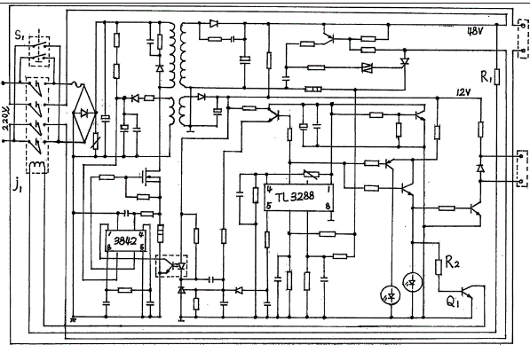 此电路的特征是:需用元件少、结构简单、实用性强、安全可靠。各元件的选取和作用:开关采用四路或二路或一路无自锁自还原的按键式或旋转式,作为充电器初始工作的启动开关使用,用S1表示;继电器采用二路或四路线圈电压采用直流12伏或48伏或定制电压,作用是控制市电输入线和负载输出线与电路板的连接和断开,用J1表示;三极管和电阻组成是继电器的控制电路,使触点工作在吸合与断开的状态下,三极管用Q1表示,电阻用R1、R2、R3表示,以上元件的工作参数随机而定。