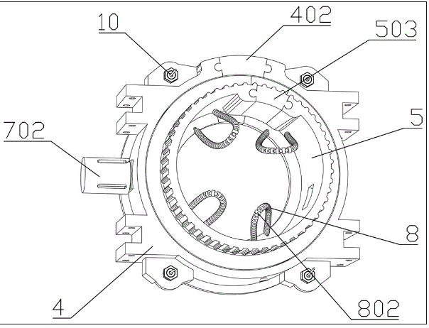更进一步,所述固定座的外周均匀设置有不少于三个锁线器,固定座的靠近所述梳线装置的一侧固定有环状端板,所述端板上开有多个与所述锁线器的位置一一对应的通孔,所述限位链的绳线的一端从端板内侧穿过其中一个通孔和与通孔对应的锁线器,绳线的另一端固定在所述转动圈上,通过按压锁线器调节绳线的使用长度。
