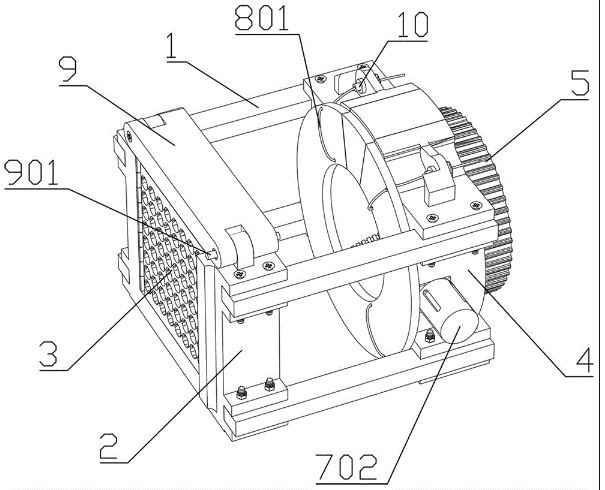 在互联网数据中心机房的施工建设过程中会涉及到铺设大量网线,由于网线自身柔软易卷曲,当网线过多或过长时会相互缠绕成团状,继而阻碍施工速度影响工程质量,对网线进行梳理后再多段捆扎可以避免这一问题。现有技术中有以下几种做法,一种是不借助工具完全由施工人员手工梳理并捆扎,通常应用在搭建小型机柜时,这种方法虽然可以使网线聚拢为一束,但可能需要两人一起操作并且过程费时费力,完成效果也不够美观;一种是先使用现有市场中的篦子式梳线器将网线梳开,施工人员再用一只手将梳开后的网线手工聚拢、另一只手捆上捆扎带,这种方法虽然一人即可完成,但长时间的握紧动作会受到人体有限的耐力与注意力影响,导致部分段网线有松有紧,而受力不均的网线很容易形成弯曲,影响工程质量;还有一种是使用固定支架逐一铺平网线再拧螺丝固定,但由于需要的支架数量多再加上繁琐的拧螺丝操作,会导致消耗大量的人力物力。为此,一种能解决上述问题的机房网线理线器为市场所需要。