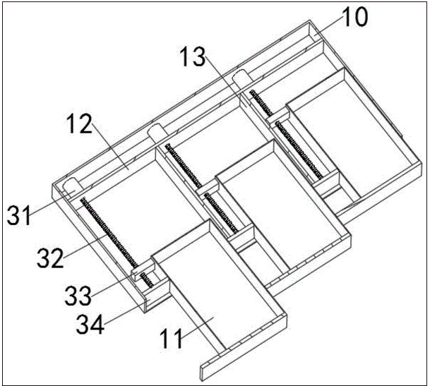 上述技术方案进一步包括:所述药盒的内壁固定连接有三个固定板,其中一组所述移动机构包括固定安装于所述药盒内壁的驱动电机,所述驱动电机的输出轴端壁固定安装有丝杆,所述丝杆活动贯穿所述第一隔板的侧壁,所述丝杆远离所述驱动电机的一端转动连接于所述固定板的侧壁上,所述抽屉的侧壁上固定连接有螺纹滑块,所述螺纹滑块螺纹连接于所述丝杆的外壁上,所述抽屉的底壁滑动连接于所述药盒的内壁上。
