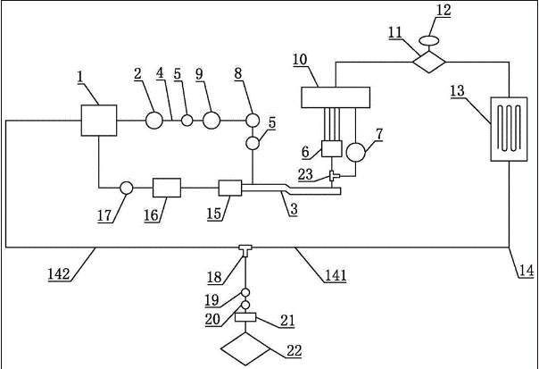 进一步,发动机废气余热再利用系统还包括空调冷凝器22支路,所述空调冷凝器22支路包括三通18、单向阀B19、水泵C20、水收集箱21和空调冷凝器22,所述回水管14包括管段A141和管段B142,所述三通18的三个管口分别连接所述单向阀B19的出水口、所述管段A141和所述管段B142,所述管段B142连接所述储水箱1,所述单向阀B19的入水口连接所述水泵C20,所述水泵C20依次连接所述水收集箱21和空调冷凝器22。从蒸汽散热器13排出的水,全部经管段B142排入储水箱1,而从空调冷凝器22排出的水,经水收集箱21、水泵B17、单向阀B19和三通18后,再经管段B142排入储水箱1内。优选地,所述水收集箱21的容量为V2,在所述水收集箱21内的水的容量为处安装有水位感应器D,在所述水收集箱21的底部安装有水位感应器E。如果水位感应器D检测到水回收箱16内的水位过高,则水泵C20可以加大马力向储水箱1内抽水,将水收集箱21内的水多排出一些。如果水位感应器E检测到水回收箱16内的水不足,则水泵C20暂停工作,让水收集箱21内进行蓄水。