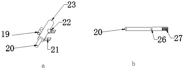 请继续参见图5a和图5b,本实用新型提供的折立式女性小便马桶,水开关13包括伸缩轴20,所述伸缩轴20一端与踏板3连接,另一端设于轴套23中,所述伸缩轴20设于轴套中的端部设有弹簧27,所述伸缩轴20中部设有通水孔26,所述轴套23中设有密封橡胶条;所述踏板3处于下压状态时,伸缩轴20深入轴套23,弹簧27被压缩,通水孔26将进水口22与出水口19连通,水流进入小便池2;所述踏板3处于放松状态时,在弹簧27压力作用下,伸缩轴20部分退出轴套23,通水孔26、进水口22和出水口19被密封橡胶条堵塞。所述水开关13通过开关固定孔21固定在马桶壳体1中。