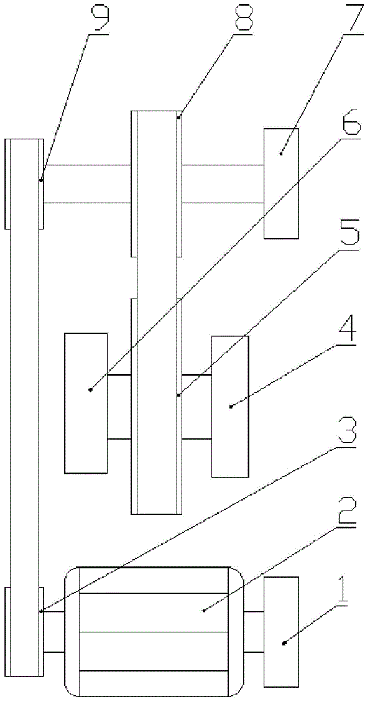 所述驱动装置包括双轴电机2,所述双轴电机2两侧均设有输出轴,两侧输出轴分别连接有第一旋转轮3和第二旋转轮1,所述第一旋转轮3通过皮带三连接有第三旋转轮9,所述第三旋转轮9中心位置连接有第一旋转轴,所述第一旋转轴另一端连接有第五旋转轮7,中间部位连接有第四旋转轮8,所述第四旋转轮8通过皮带四连接有第六旋转轮5,所述第六旋转轮5中心部位连接有第二旋转轴,所述第二旋转轴两端分别连接有第七旋转轮4和第八旋转轮6,