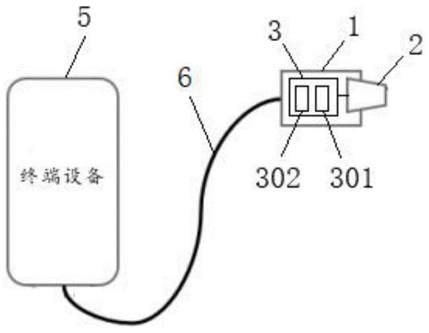 1:壳体;2:测温部;3:通讯部;301:信号接收件;302:信号发送件; 4:连接部;401:壳体连接端;402:设备连接端;5:终端设备;6:线缆。
