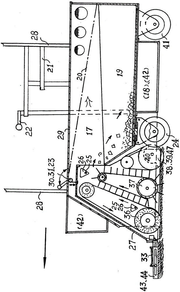 1长毛刷条、2毛刷、3框架直杆、4履带基布、5活动叶片、6销管销套、 7辊筒、8框架杆、9侧杆、10斜筋,11滑套、12凹槽、13横轴、14粘压条带、15槽缝、16横销、17车架、18电池、19料斗、20滤布、21座椅、22手柄杆、23拉线、24驱动(转向)轮、25卡销连杆、26卡槽、27清扫机构、28 固定杆架、29车架面板、30横管、31手柄、32顶篷、33拉簧、34三角卡槽、 35销钉、36前端辊筒、37清扫辊筒、38后部辊轮、39吹风筒、40风机、41 行走轮或万向轮、42箱盒、43刮帚架、44刮帚、45担架、46、活动踏板、47凸块。