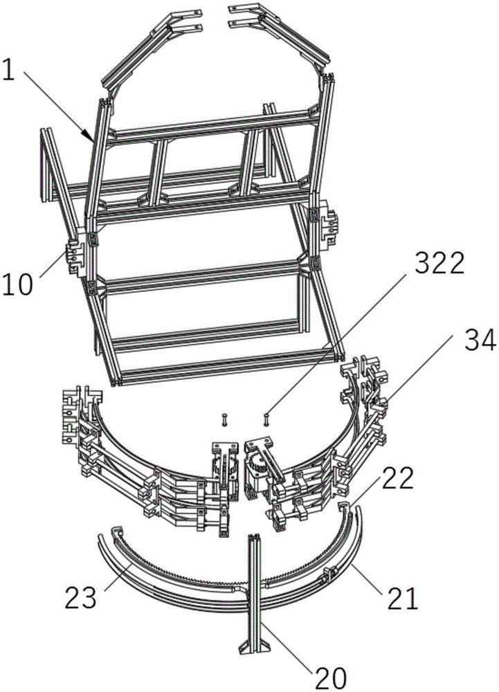 具体的,固定架30的顶部位置处一体成型有呈水平状设置的顶部固定板32,顶部固定板32内正对弧形孔231的位置处设置有安装孔321,弧形孔231和安装孔321内插接配合有铆钉销轴322,铆钉销轴322与安装孔321之间滑动连接,铆钉销轴322与弧形孔231之间也为滑动连接,保证顶部固定板32能够沿着弧形孔231的轨迹运动;