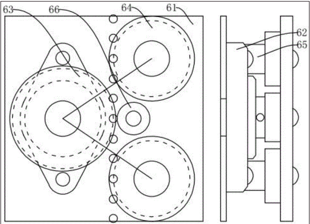 如图1~图8所示,所述主轴一侧设有防脱组合链轮60,所述防脱组合链轮60包括底板61、轴承座62、主动链轮16、被动链轮64、垫套65和滑轮66,所述轴承座62固设于底板61一侧,所述主动链轮16、被动链轮64转动设于底板61一侧,所述垫套65设于被动链轮64与轴承座62之间,所述滑轮66转动设于两个被动链轮64之间。