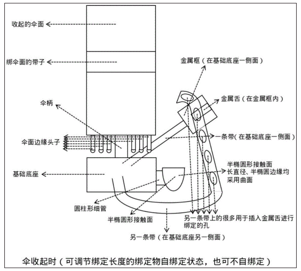 名称:可绑定伞或使伞能够实现可绑定的绑定物 专利号:202510831211.8 专利权人:许秀权 技术领域 本发明涉及伞具技术领域。本发明具体是一个可绑定伞或使伞能够实现可绑定的绑定物的新的被开辟出来的领域。不需要手持即可固定在使用者身上物体上的伞具结构,适用